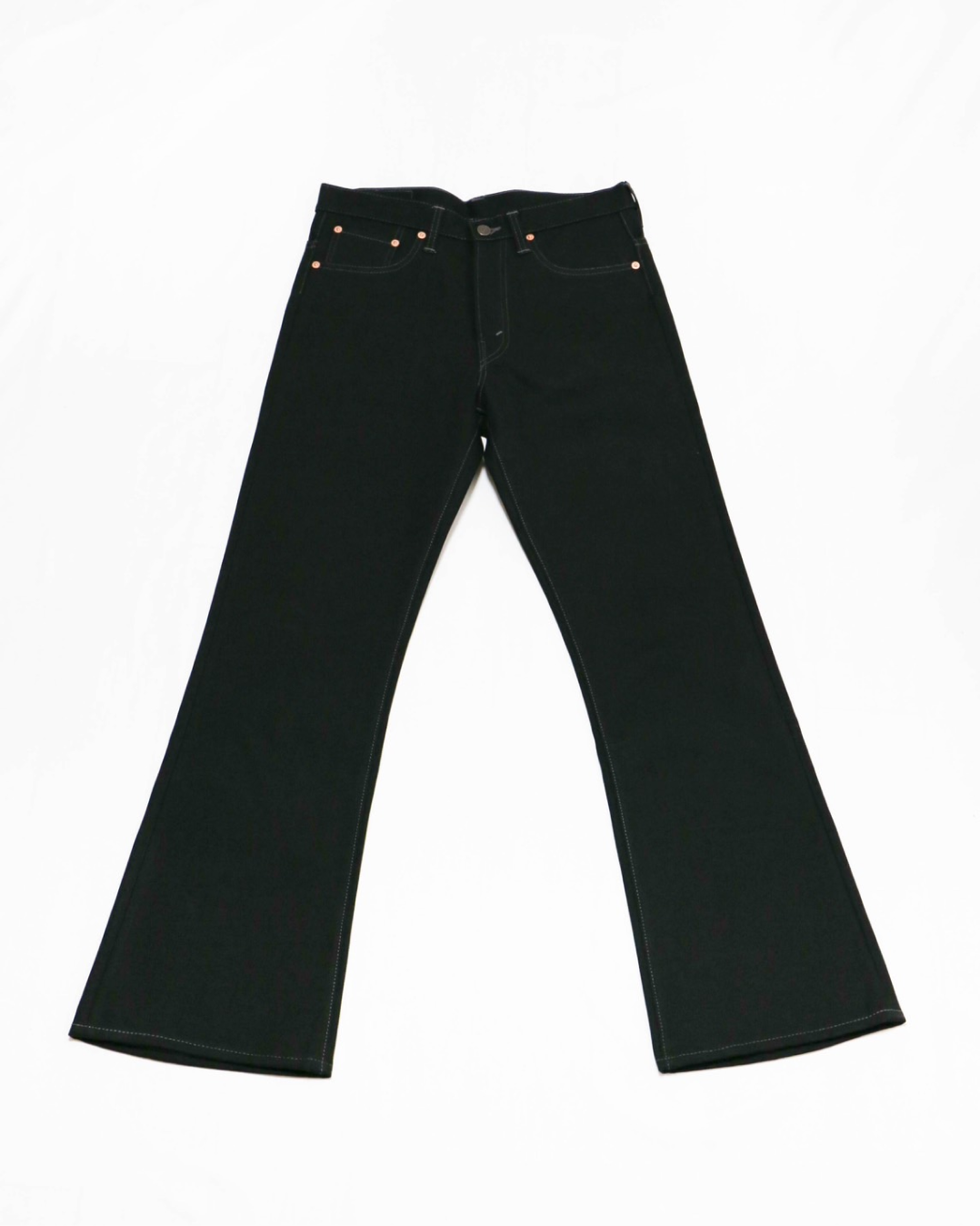 These bootcut black jeans are inspired by the details, stitching, and patterns of vintage Levi's bootcut jeans from lot number 517 from the early 1970s. The fabric is approximately 14 oz and is developed using sulfur black fabric from the 1990s. The slim fit around the thighs and the elegantly flared bootcut silhouette towards the hemline enhance the overall style. In line with the historical context, cotton thread and core thread are used depending on the sewing location. These jeans are made by skilled craftsmen using vintage sewing machines such as Singer and Union Special.