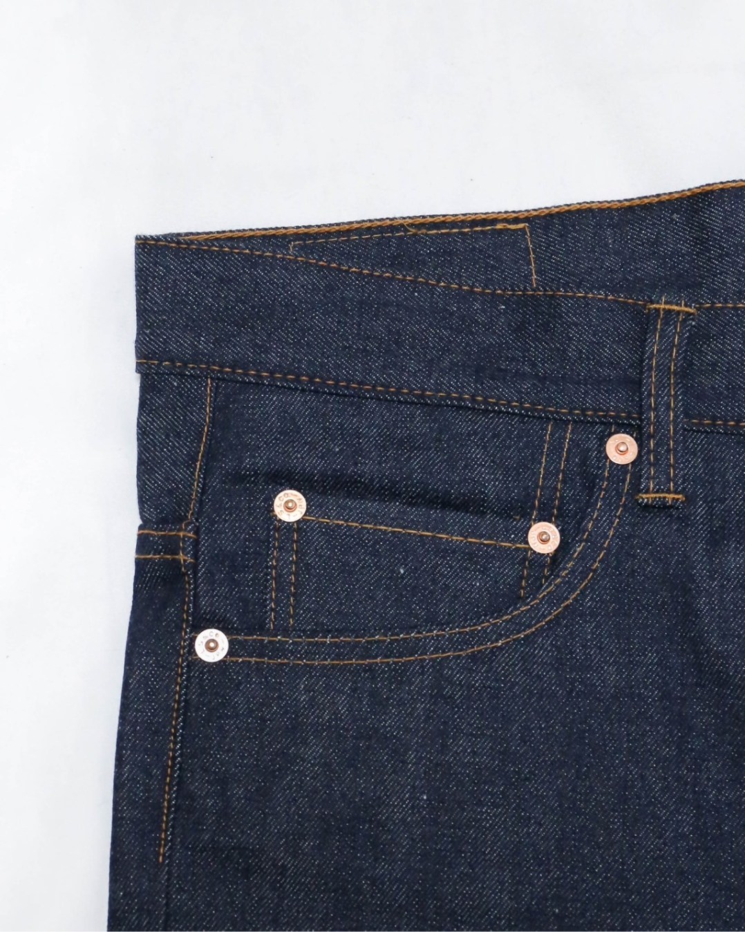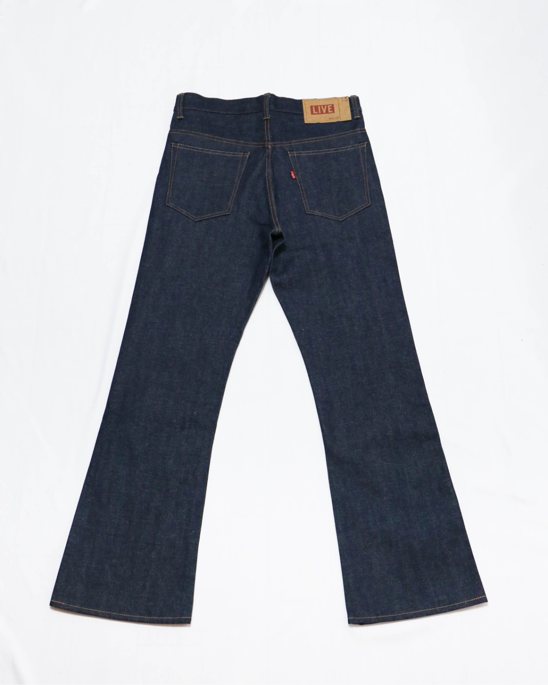 These bootcut jeans are inspired by the details, stitching, and patterns of vintage Levi's bootcut jeans from lot number 517 from the early 1970s. The approximately 14 oz selvedge fabric was developed using deadstock fabric from the 70s, resulting in a beautiful vertical fade over time. The slim fit around the thighs and the bootcut silhouette that elegantly widens towards the hem enhance the overall style. In line with the historical context, orange stitching is applied throughout the jeans, with cotton thread and core thread used depending on the sewing location. These jeans are sewn by skilled craftsmen using vintage sewing machines such as Singer and Union Special.