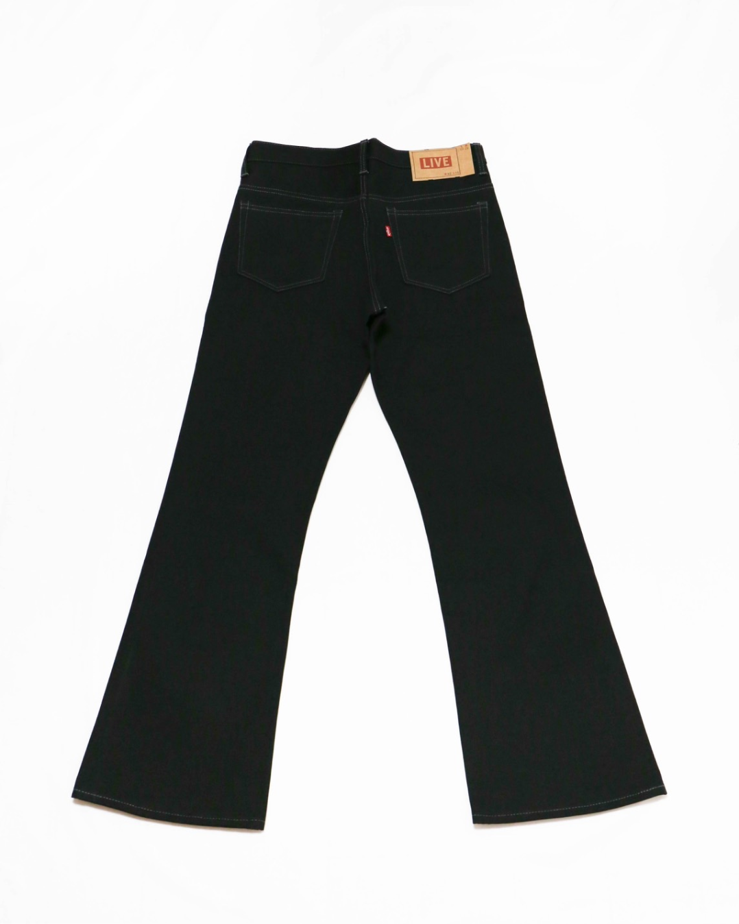 These bootcut black jeans are inspired by the details, stitching, and patterns of vintage Levi's bootcut jeans from lot number 517 from the early 1970s. The fabric is approximately 14 oz and is developed using sulfur black fabric from the 1990s. The slim fit around the thighs and the elegantly flared bootcut silhouette towards the hemline enhance the overall style. In line with the historical context, cotton thread and core thread are used depending on the sewing location. These jeans are made by skilled craftsmen using vintage sewing machines such as Singer and Union Special.